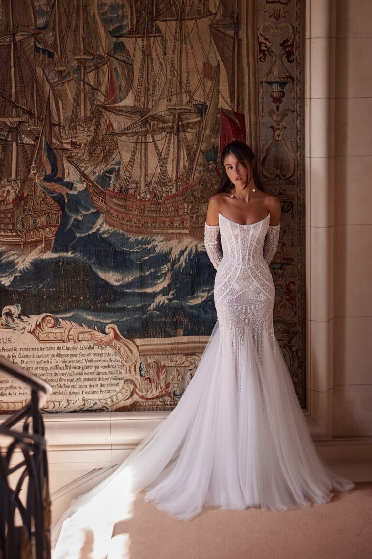 Venčanica Aletea je pravi primer luksuzne elegancije. Korsetski gornji deo sa spuštenim ramenima naglašava siluetu, dok su dugi čipkasti rukavi ukrašeni bisernim i sjajnim detaljima. Raskošni vez i ručno aplikovani ornamenti stvaraju bogat i jedinstven izgled, dok tanka tkanina u donjem delu haljine dodaje lakoću i pokretljivost. Sirena kroj prelazi u tilasti šlep koji unosi dozu romantične gracioznosti. Idealna za mladu koja želi sofisticiranost i raskoš u jednom.