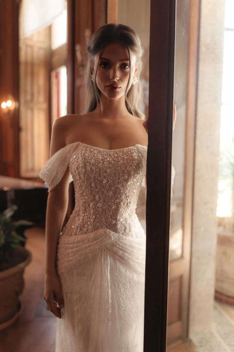 Venčanica Cortez predstavlja savršenu posvetu ženstvenosti, inspirisanu antičkim boginjama. Izrađena od gipure sa ručno vezenim cvetnim aplikacijama, perlama i šljokicama, odiše sofisticiranom teksturom i nežnim sjajem. Korset sa mesečastim izrezom oblikuje dekolte, dok drapiranje na bokovima podseća na linije grčkog hitona. Spuštene bretelice nežno padaju preko ramena, unoseći dozu senzualnosti i elegancije. Lagano proširen donji deo haljine prelazi u kratak šlep sa zaobljenim ivicama, dopunjujući skladan izgled. Diskretno pertlanje i rajsferšlus na leđima obezbeđuju savršeno prijanjanje i čistu, elegantnu siluetu. Idealna je za mladu koja želi spoj klasične gracioznosti i moderne sofisticiranosti.