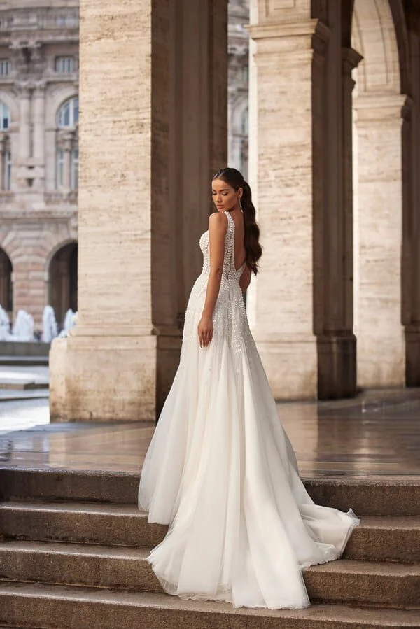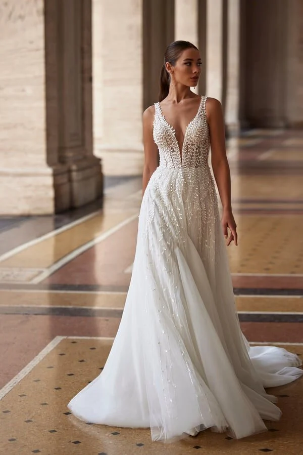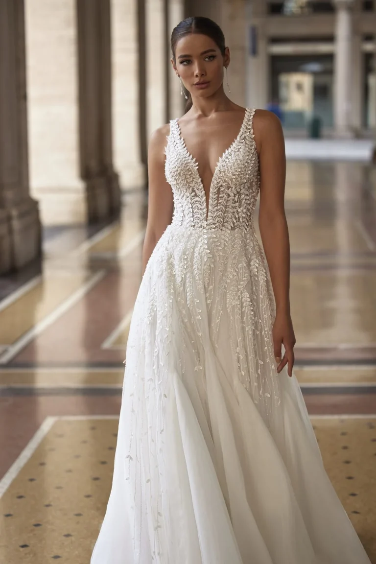Romantična A-linijska venčanica sa slojevitom suknjom i šlepom. Cela haljina je ukrašena cvetnim aplikacijama koje podsećaju na cvetanje javorove loze. Dekor je izvezen šljokicama i perlicama, što haljini daje poseban sjaj i eleganciju.