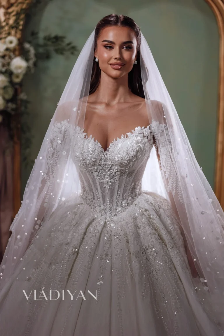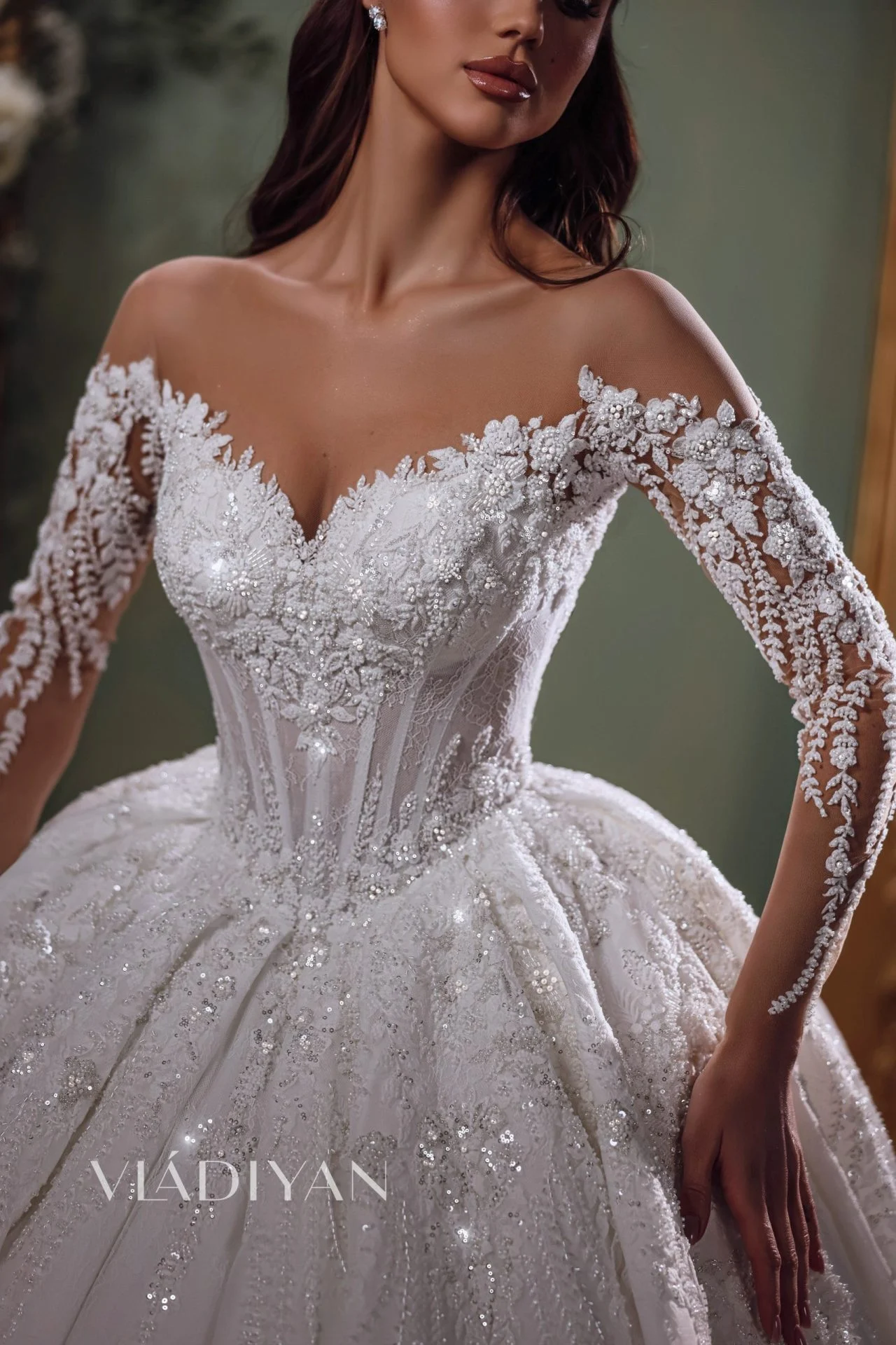 Ova kraljevska balska venčanica ističe strukturirani korsett bodi koji lepo definiše siluetu, pružajući i podršku i eleganciju. Iluzijske dugačke rukave dodaju bezvremenski i rafiniran dodir, savršeno upotpunjujući struk u obliku trokuta koji ističe figuru. Izrađena od najfinije Chantilly čipke, voluminozna suknja ima meke, tečne nabore koji stvaraju veličanstven efekat. Očaravajuće cvetne čipkaste aplikacije su pažljivo postavljene po celoj venčanici.