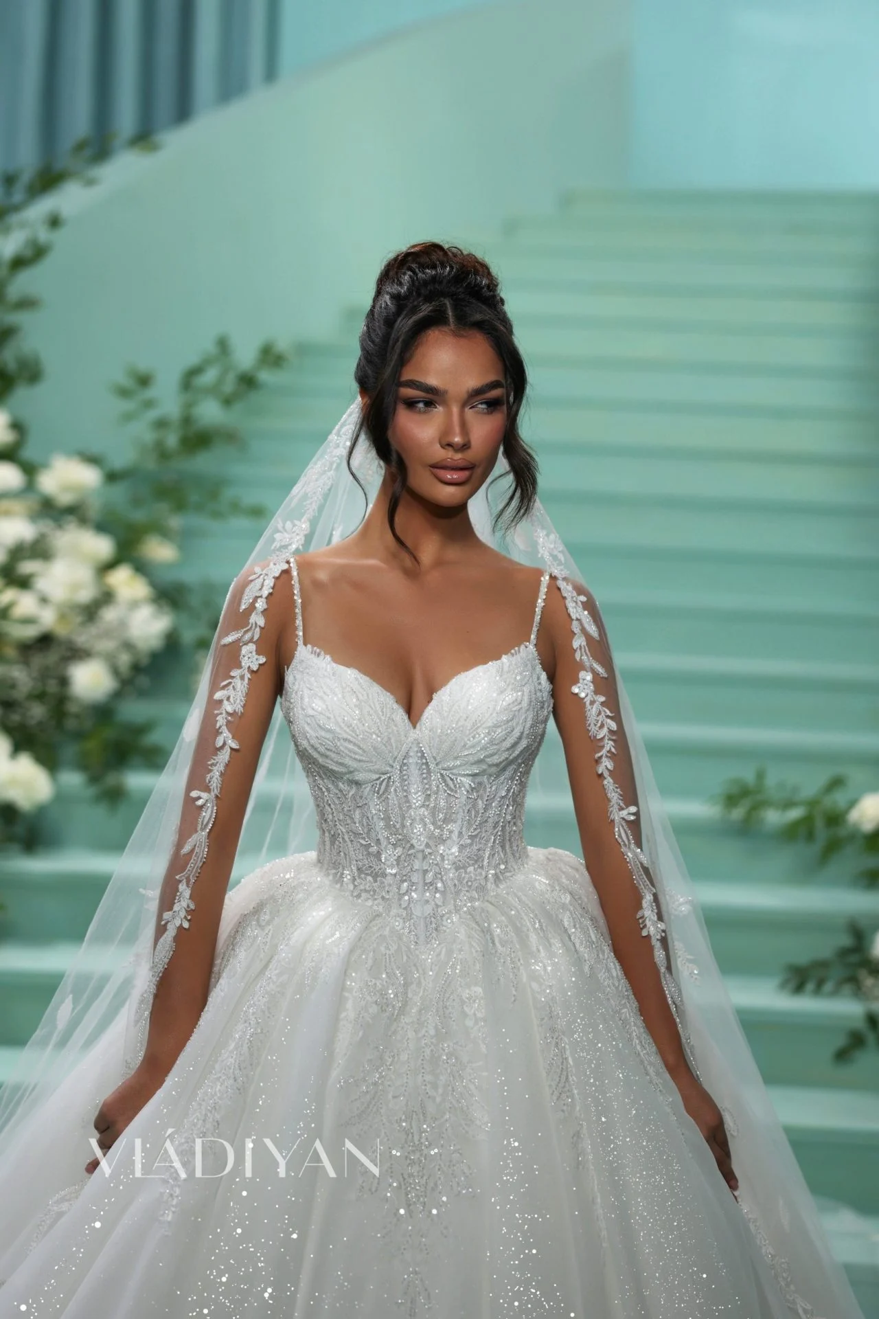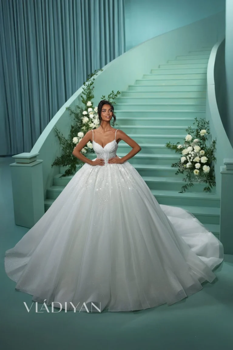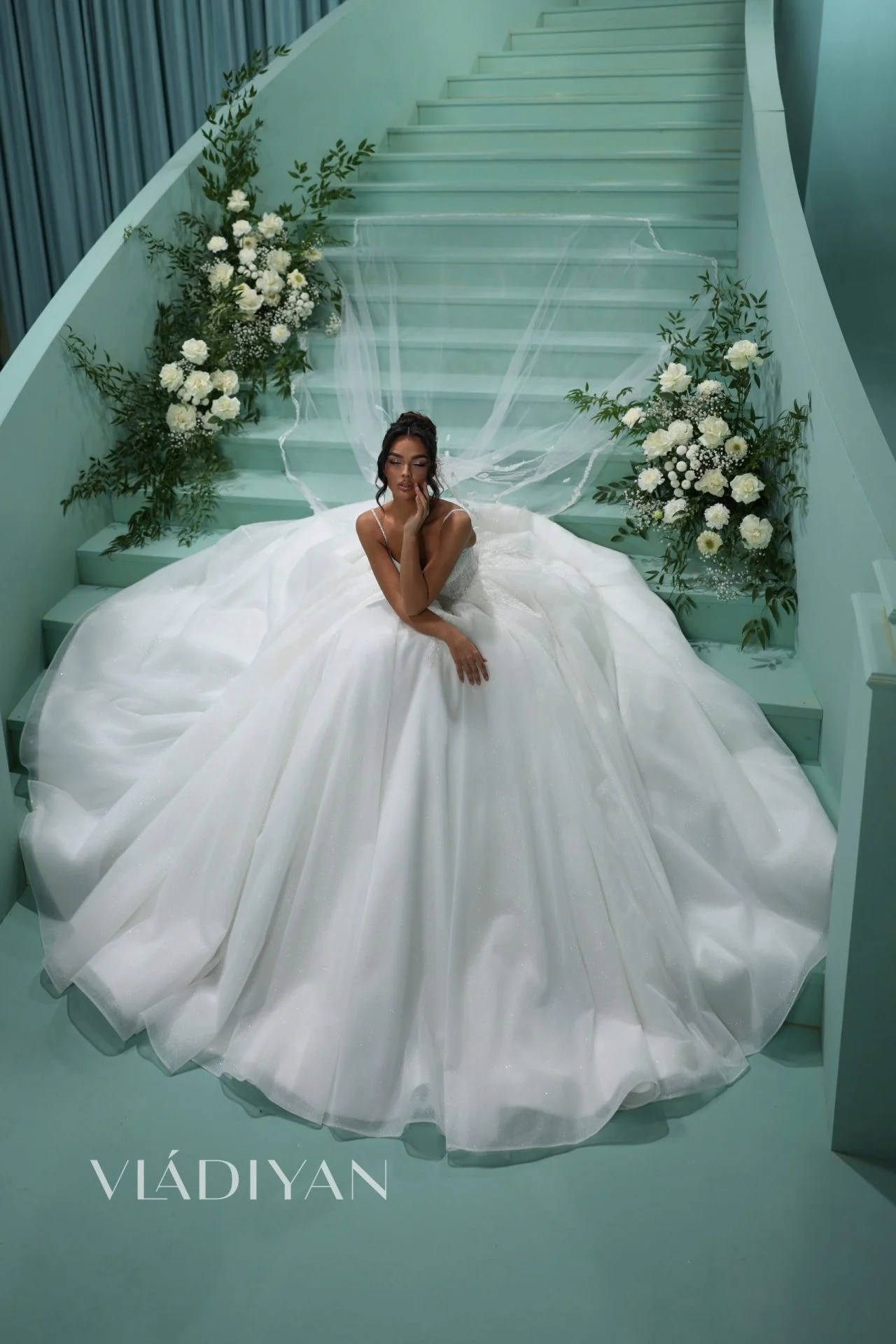 Ova prelepa korsetska balska venčanica ima laskav izrez sa tankim trakama. Gornji deo i suknja su ukrašeni najfinijom čipkom. Suknja je izrađena od laganog svetlucavog materijala, koji daje suptilan sjaj sa svakim pokretom, dok zadržava puninu u stilu princeze.