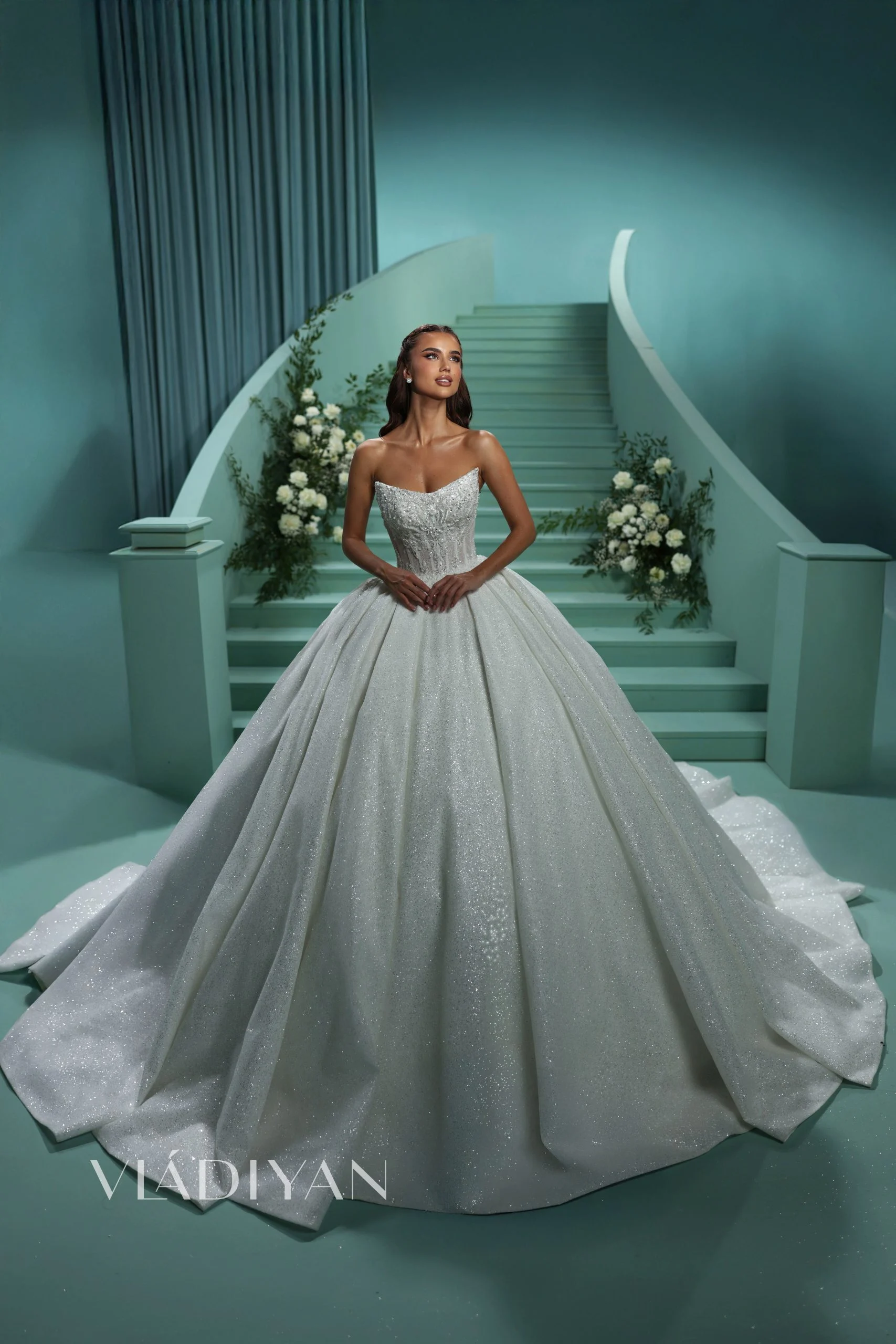 Raskošna balska venčanica sa korzetnim gornjim delom i elegantnim čamcem izrezom. Bogato je ukrašena finom čipkom i kristalima koji nežno prelaze sa korseta na suknju, stvarajući savršenu harmoniju između gornjeg i donjeg dela. Voluminozni nabori suknje dodaju dubinu i pokret, dok tkanina sa blistavim šljokičastim efektom pruža očaravajući sjaj koji oduzima dah.