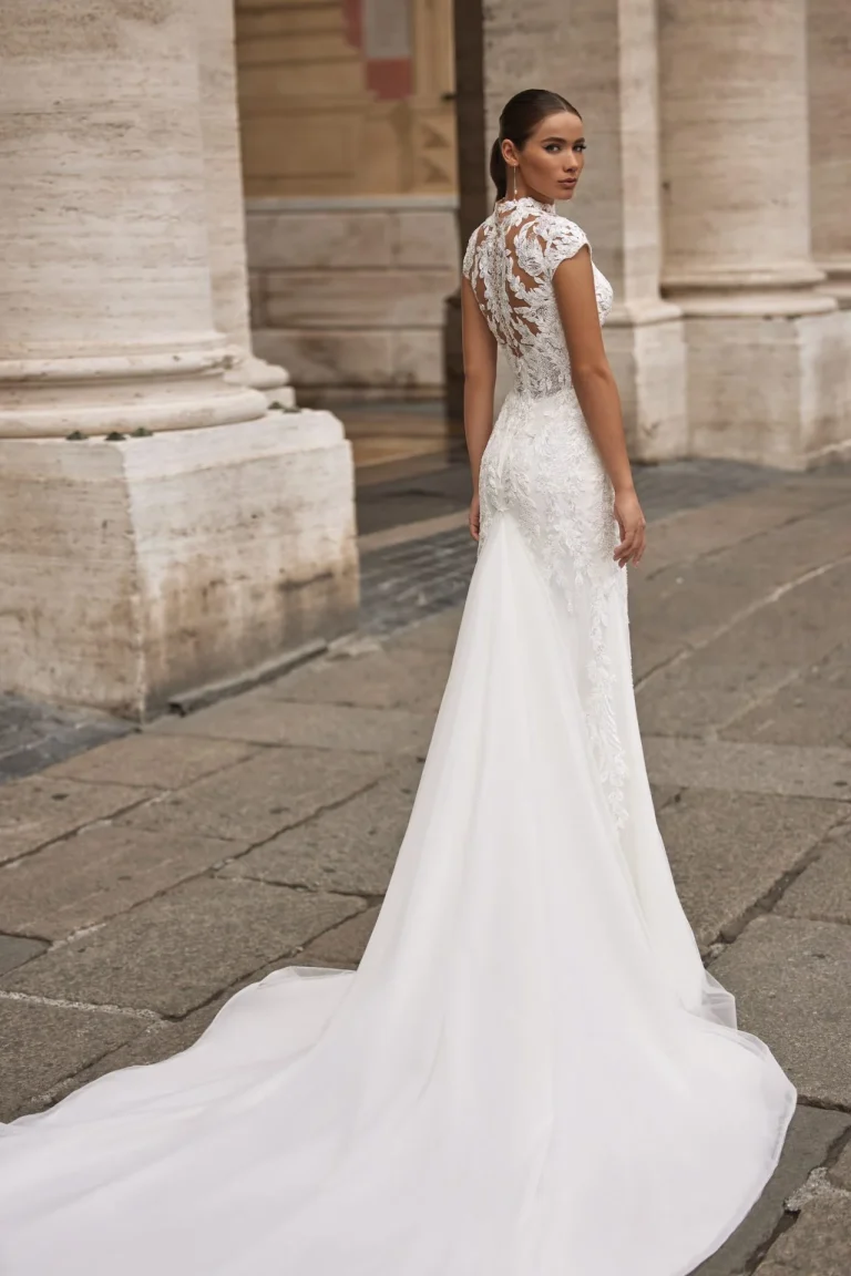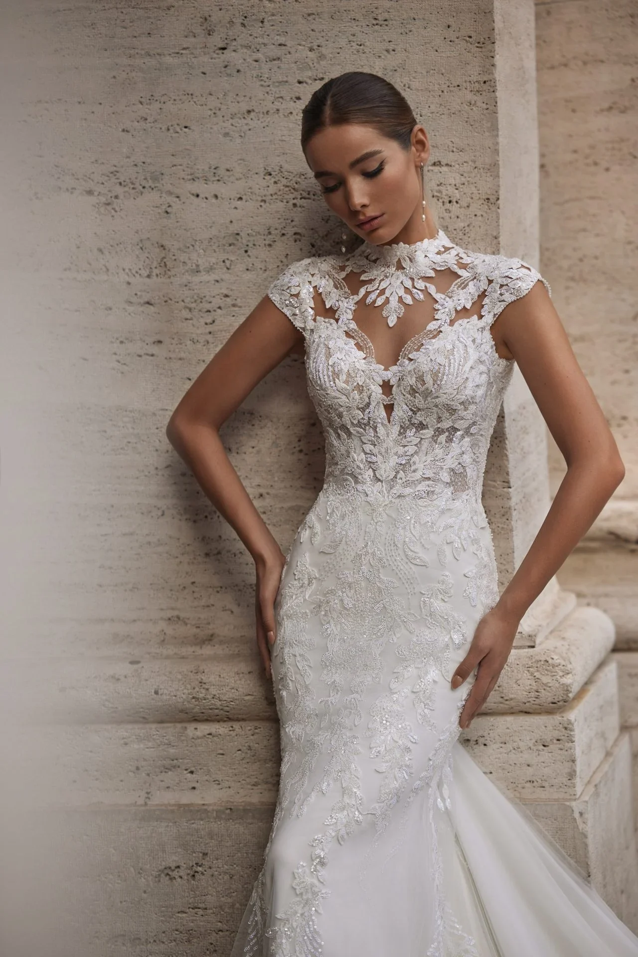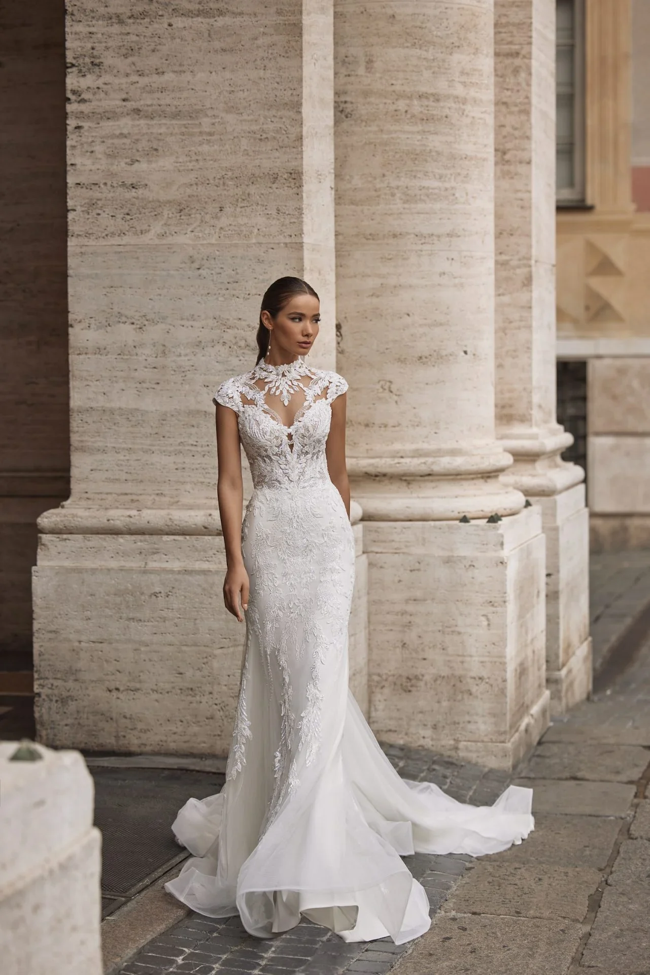Prelepa transformabilna venčanica Hezel kombinuje ženstveni sirena kroj sa odvojivim mekim tila šlepom. Glavni deo haljine ukrašen je izvezenim cvetnim motivima, čiji šljokasti detalji presijavaju u sunčevim zracima, stvarajući zapanjujući efekat. Iluzija izreza, stajaći ovratnik i ramena mlade ukrašeni su delikatnim aplikacijama, dodajući haljini dašak elegancije i glamura.