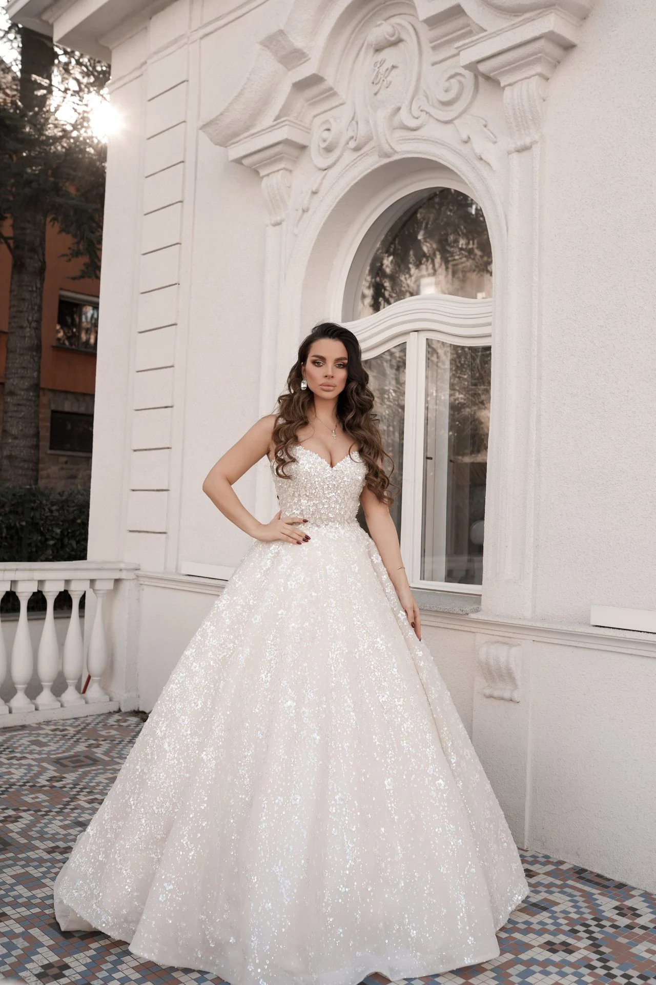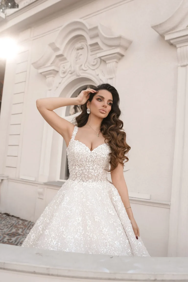 Venčanica u A liniji izrađena je od luksuzne čipke sa 3D cvetićima, dodatno ukrašenim svetlucavim kružićima. Ovaj dizajn savršeno balansira eleganciju i udobnost, posebno pogodna za devojke sa jačim grudima, jer pruža podršku i oblikuje siluetu. Sa svojim modernim i elegantnim izgledom, Kiara je idealan izbor za mladu koja želi da zablista na svom venčanju.