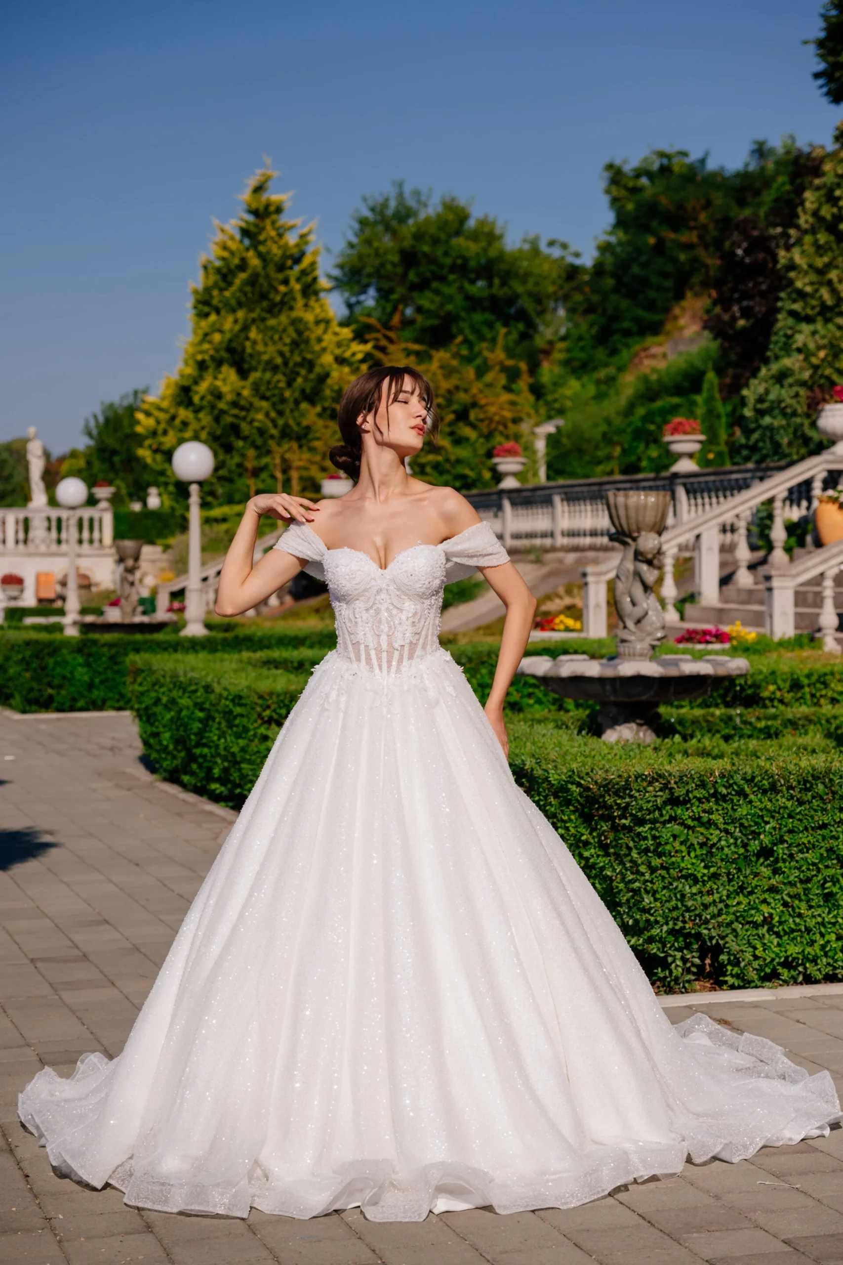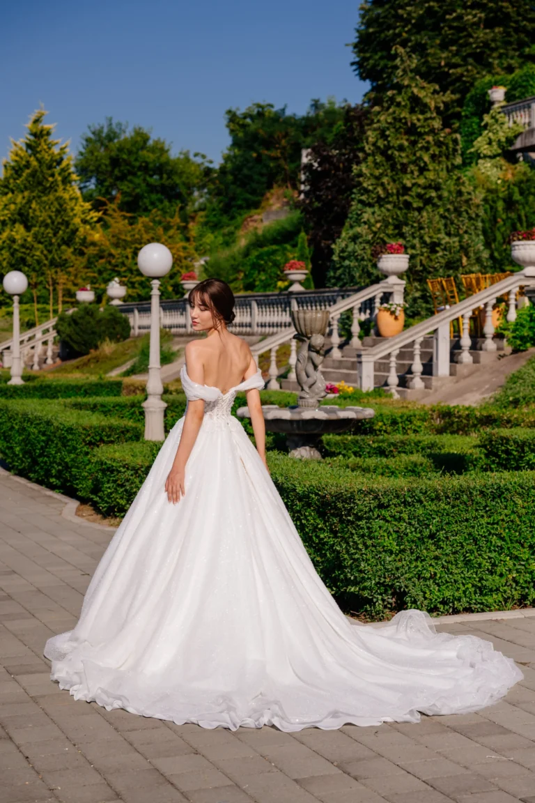 Venčanica Ksenija odiše pravom kraljevskom elegancijom. Gornji deo je ukrašen raskošnim vezom i čipkom, dok korpe korseta sa prozirnim detaljima naglašavaju figuru na sofisticiran način. Posebnu čar pružaju spušteni rukavi koji se nežno oslanjaju na ramena, stvarajući romantičan i bajkovit izgled. Suknja u princeza i A kroju, sa bogatim slojevima tila i suptilnim svetlucavim efektom, pruža grandiozan volumen i besprekornu siluetu. Ova venčanica je idealna za mladu koja želi da zablista u glamuroznom i svečanom stilu.
