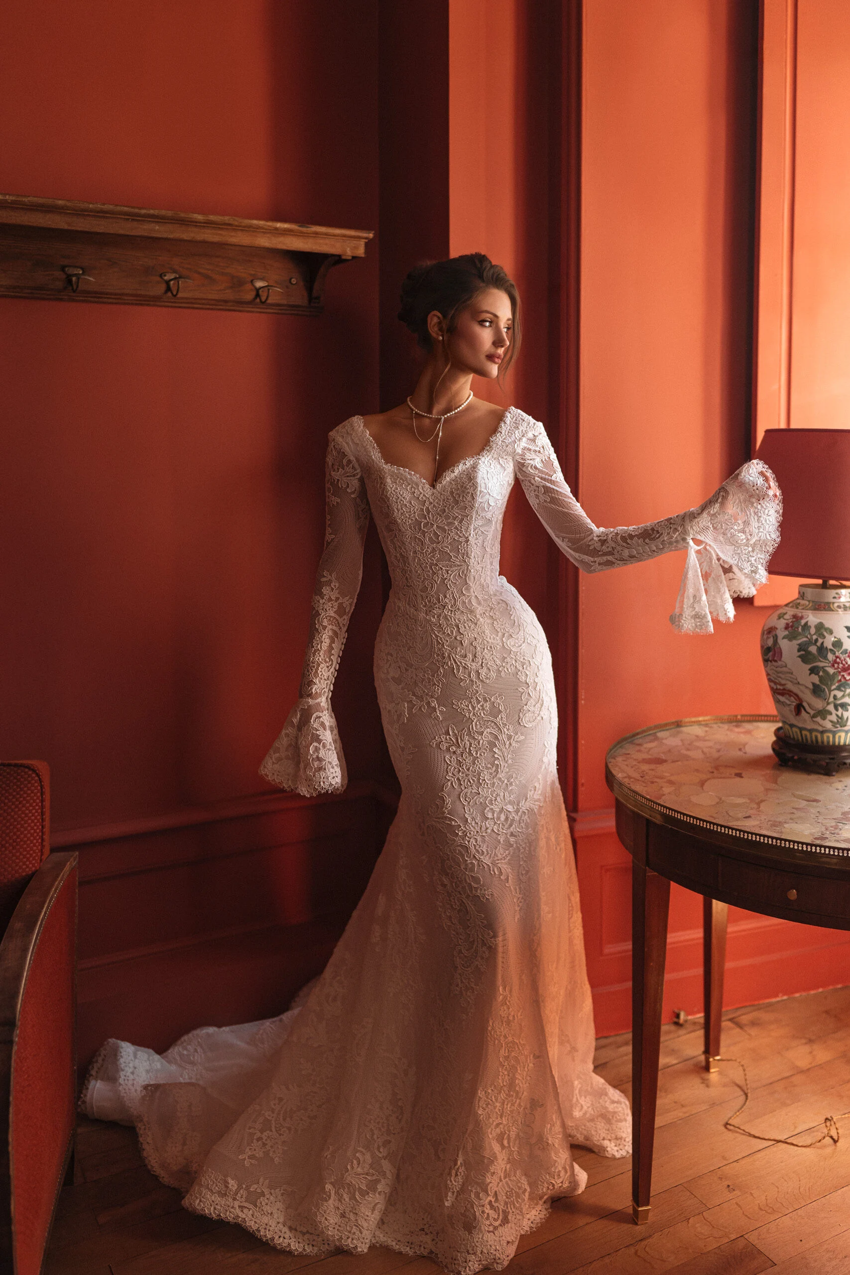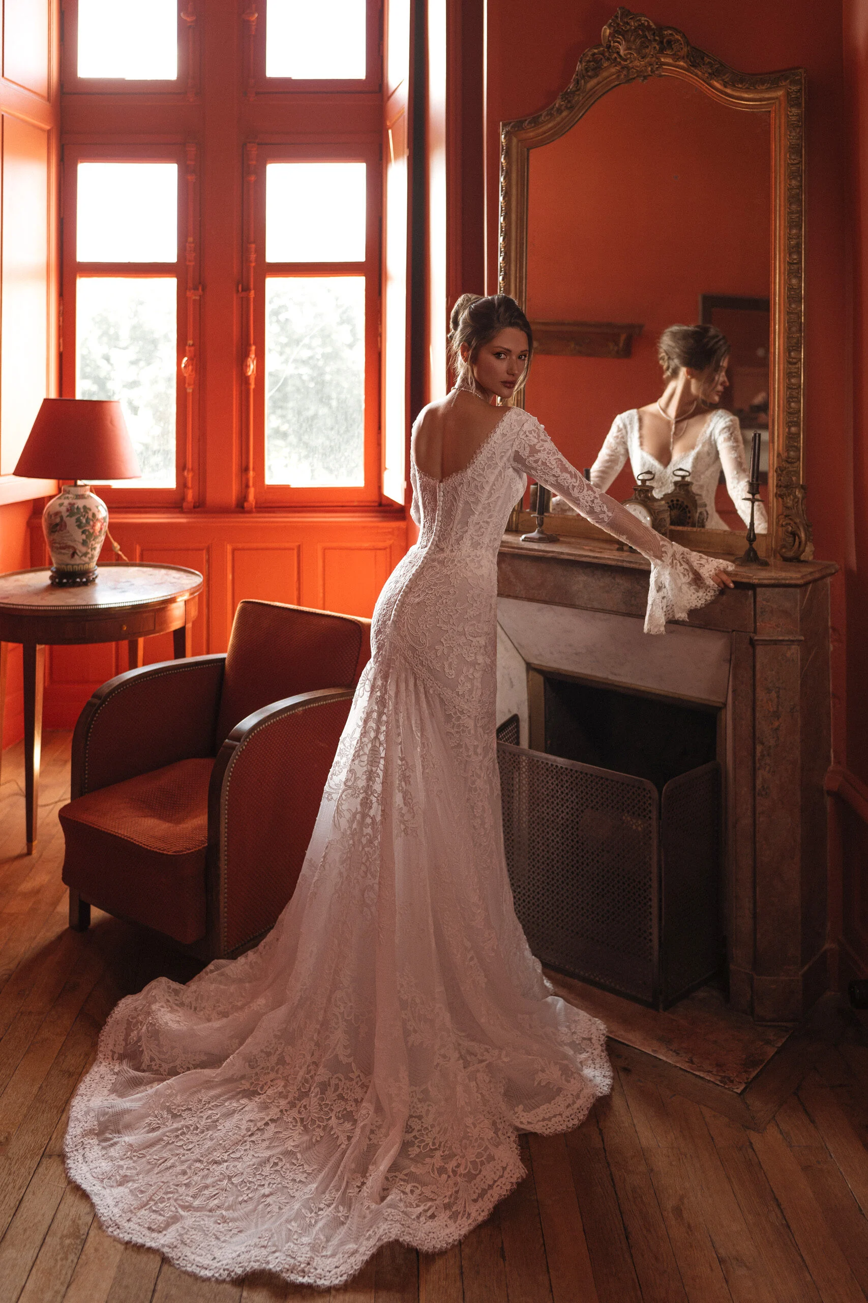 Venčanica Meadow odiše raskošnom ženstvenošću nadahnutom španskim romantizmom. Uski mermaid kroj naglašava figuru, dok višeslojna čipka sa cvetnim motivima obavija telo poput luksuznog čipkanog ornamenata. Srcoliki izrez napred prelazi u elegantan V izrez na leđima, a dugi čipkani rukavi sa karnerima i zvonastim završetkom podsećaju na flamenco stil, donoseći dozu strasti i dramatike. Diskretno pertlanje, rajsferšlus i dugmad pozadi upotpunjuju skladan izgled. Idealna je za mladu koja želi sofisticiran i romantičan izgled sa primesom južnjačkog šarma.