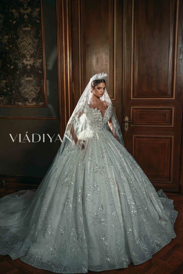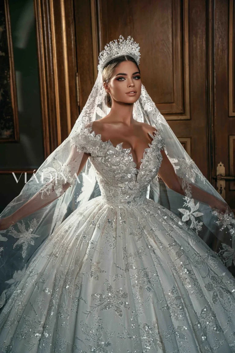 Ova prelepa venčanica sa off-shoulder krojem odiše nevjerojatnom elegancijom i glamuroznošću. Korset, bogato ukrašen 3D aplikacijama, perlicama i kristalima, stvara očaravajući detalj koji privlači poglede. Svetlucava suknja koja se preliva u zapanjujući dugi šlep, donosi nezamjenjivu dozu sofisticiranosti i šarma, stvarajući savršen izgled za mladu koja želi da zablista na svom posebnom danu.