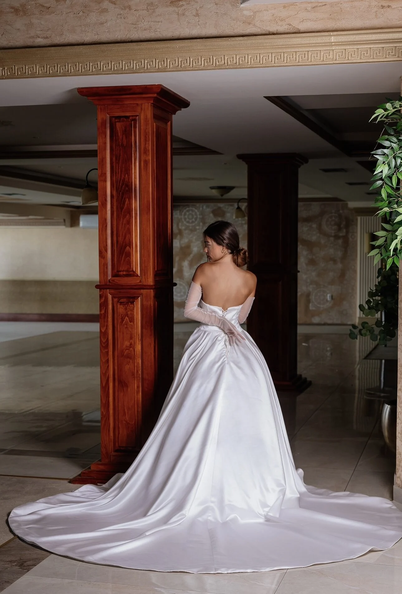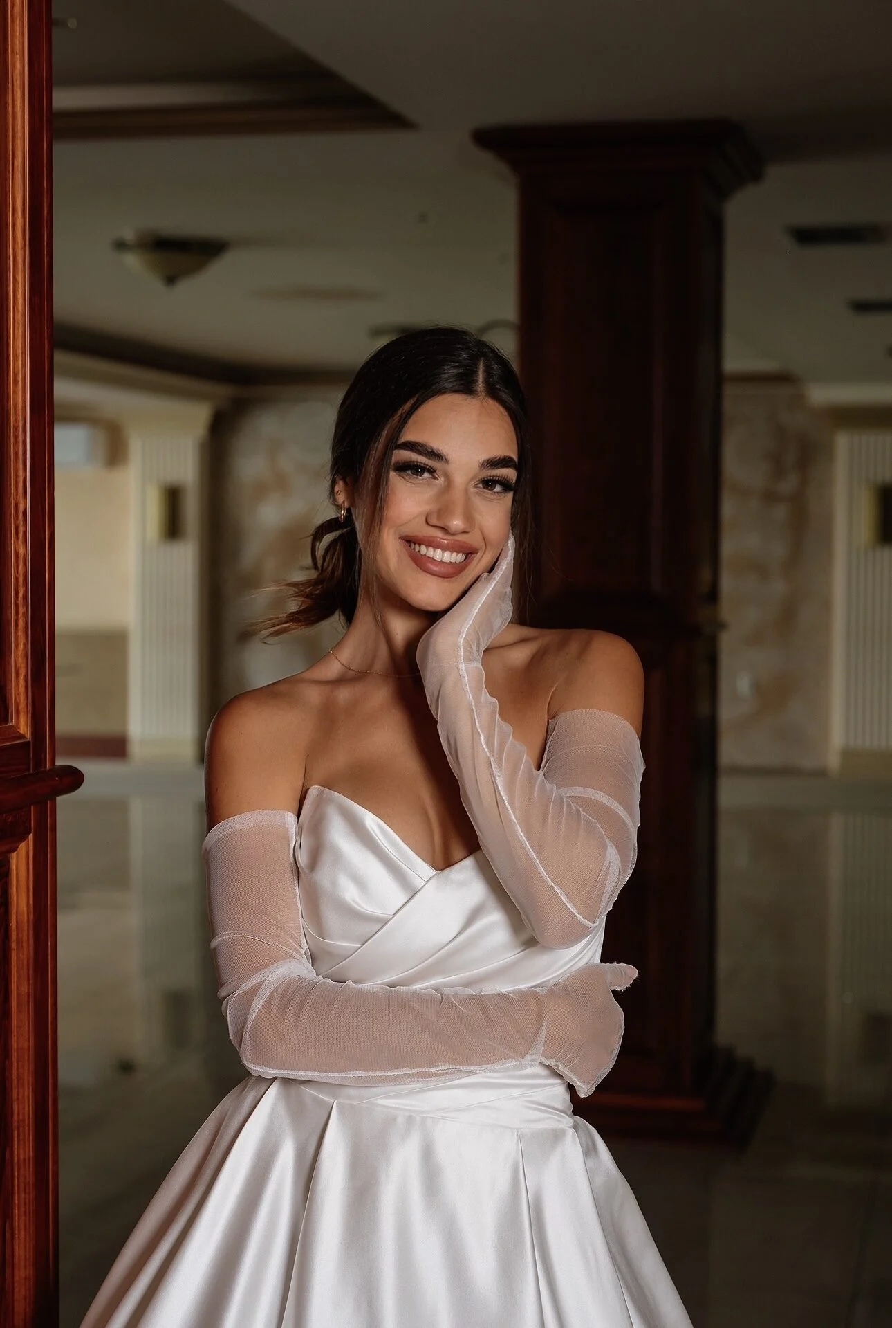 Venčanica Sara odiše jednostavnošću koja se pretvara u pravu eleganciju. Izrađena od luksuznog satena, ističe se čistim linijama i besprekornim padom materijala. Srcoliki izrez u kombinaciji sa drapiranim detaljima na korsetu pruža sofisticiran i moderan izgled, dok raskošna suknja u A kroju i princeza silueti unosi dozu glamura i svečanosti. Posebnu čar daju dugi, providni rukavi od tila koji se nose kao dodatak i unose suptilnu romantičnost. Ova venčanica je savršen izbor za mladu koja želi spoj minimalizma i raskoši u isto vreme.