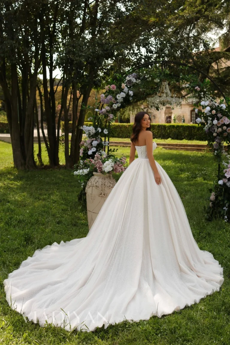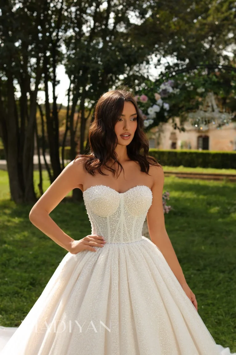 Ova venčanica bez bretela sa struktuiranim korsettom prepunim perlica donosi luksuzan i očaravajući izgled. Svetlucava suknja stvara zapanjujući efekat pri svakom pokretu, dok odvojivi prozirni rukavi dodaju delikatnu dozu elegancije. Savršen je izbor za mladu koja želi da zablista u glamuroznom i sofisticiranom izdanju.
